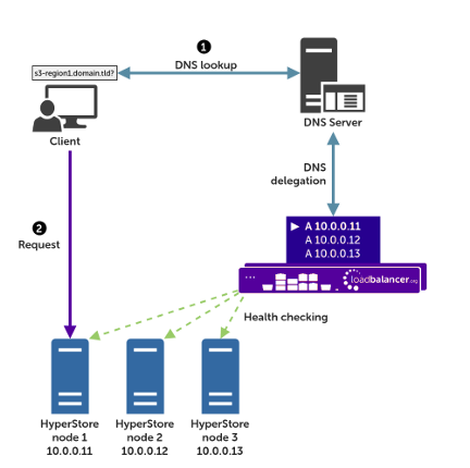- High Availability (HA): Load balancing is crucial for ensuring guaranteed uptime and consistent data access. It continuously monitors the health of all HyperStore nodes. If a node fails or becomes unresponsive, the load balancer automatically and instantly reroutes client traffic to the remaining healthy nodes. Eliminates Single Point of Failure (SPOF): By distributing traffic across multiple nodes and often being deployed in a High Availability (HA) pair itself, the load balancing layer removes any single point of failure for client access to the storage cluster. This resilience is vital for mission-critical data.