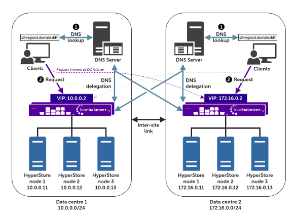- Assumes that each site’s own HyperStore cluster is being load balanced using Layer 7 SNAT Mode (Default)